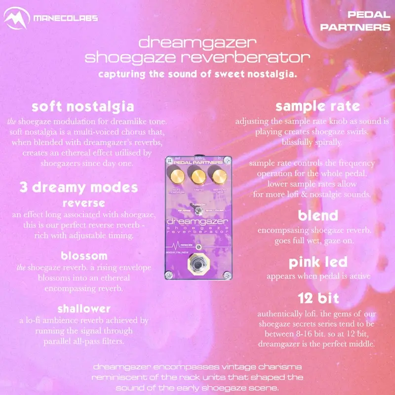 dreamgazer. the pedal partners signature shoegaze reverb, designed to hold the sound of sweet nostalgia, precisely engineered by maneco labs.